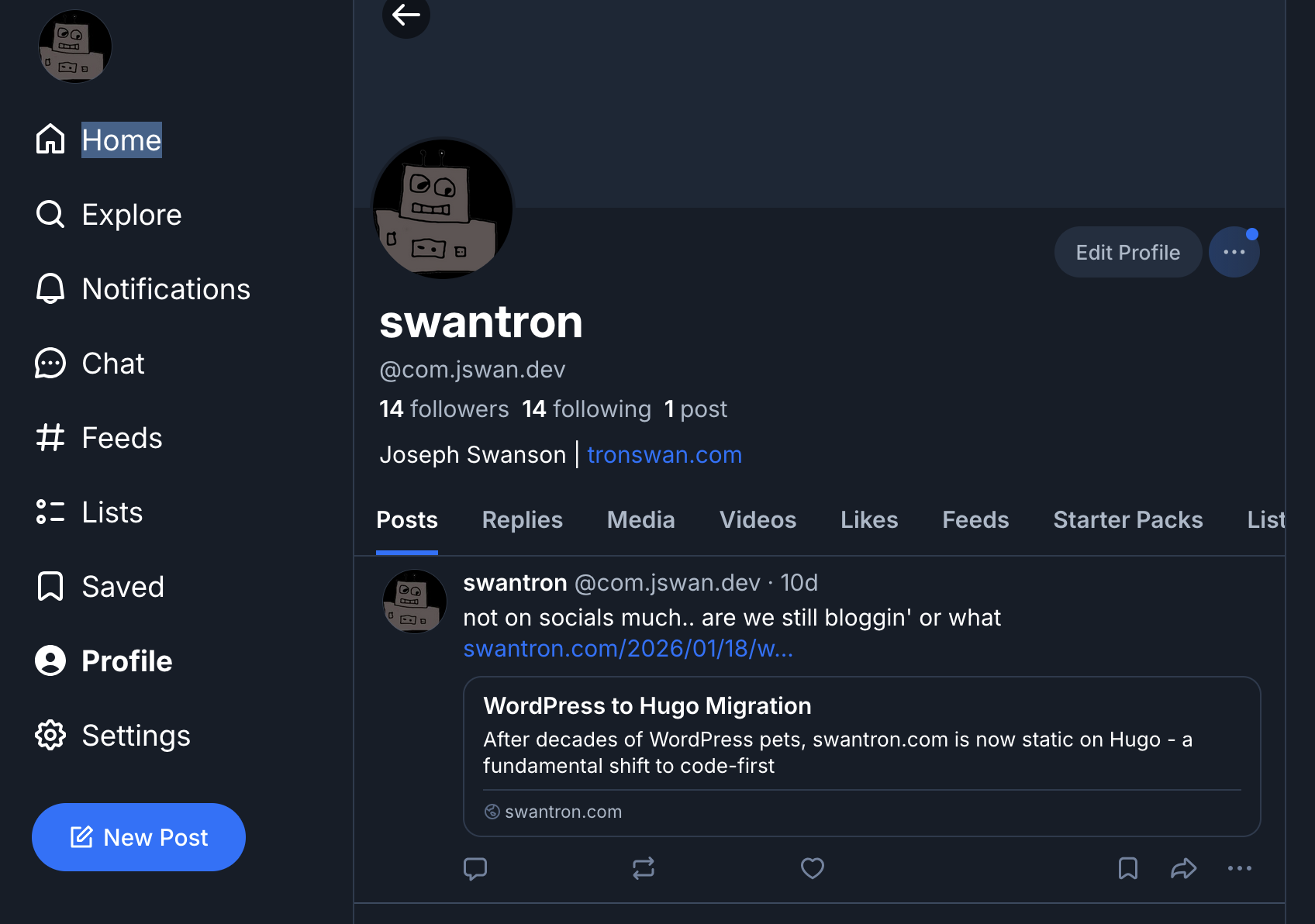 I have a Bluesky account at @com.jswan.dev, and I’ve set up this whole infrastructure, but I’m not really posting on social media. Not my thing.