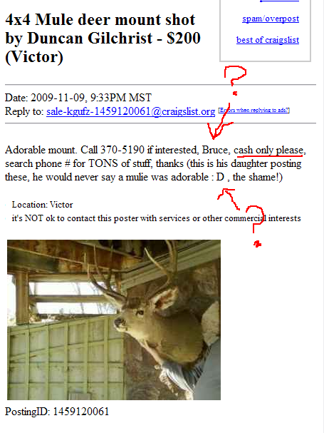 Alright…this one is sort of confusing. From what I can gather, Duncan Gilchrist’s daughter is using craigslist to fondly rib Bruce, who apparently has a history of writing bad checks. One thing is clear…Duncan Gilchrist does not like the looks of mule deer. The post is unclear as to whether or not Duncan Gilchrist finds other game animals adorable.