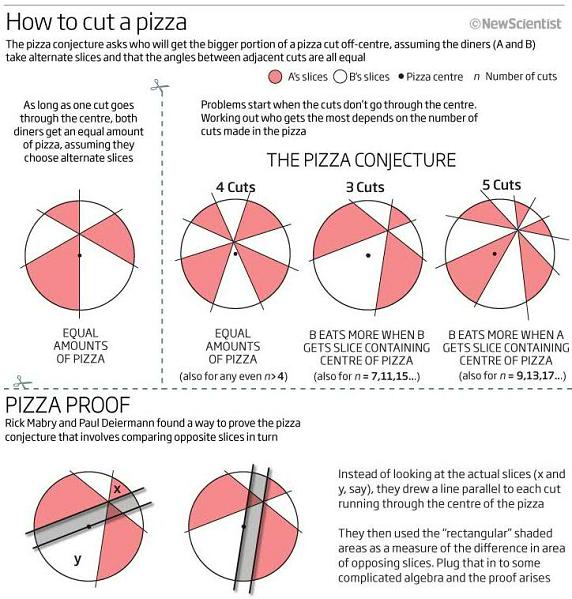 i <3 za! nom nom nom The problem at hand is essentially this: “Suppose the harried waiter cuts the pizza off-centre, but with all the edge-to-edge cuts crossing at a single point, and with the same angle between adjacent cuts. The off-centre cuts mean the slices will not all be the same size, so if two people take turns to take neighbouring slices, will they get equal shares by the time they have gone right round the pizza - and if not, who will get more?” The visual break down of the proof is this, in a nutshell: Pretty slick stuff…NewScientist reports the details in a lengthy feature.. “He [Rick Mabry] suspected that someone, somewhere must already have worked out the simple-looking sums at the heart of the new expression, so he trawled the online world for theorems in the vast field of combinatorics - an area of pure mathematics concerned with listing, counting and rearranging - that might provide the key result he was looking for. Eventually he found what he was after: a 1999 paper that referenced a mathematical statement from 1979. There, Mabry found the tools he and Deiermann needed to show whether the complex algebra of the rectangular strips came out positive or negative. The rest of the proof then fell into place (American Mathematical Monthly, vol 116, p 423).” Awesome. I need to tear into the guts of this guy…pretty sweet (and asinine) math. For the non-math inclined, here is a sweet picture of Freemo, the Talking Pizza. He is funny.
