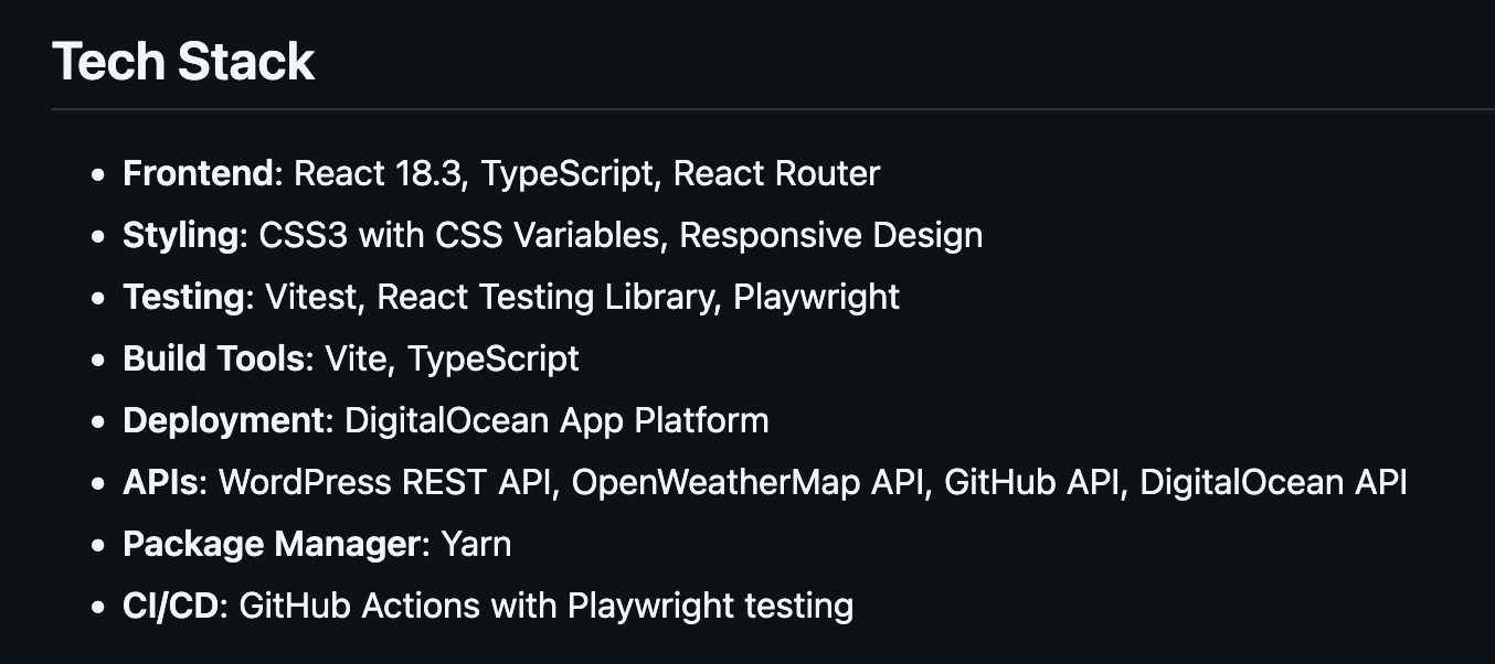 Reminder: the site is a playground, and is sort of stupid. It is also a nicely done React site with modern patterns and a legit pipeline. I run a bunch of health checks for other services.. there is a nice weather feature.. I use it to stream Spotify while I work. It is all over the place.