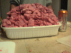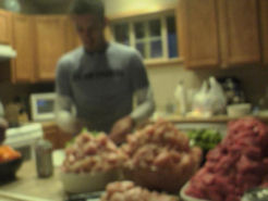 Friday. Half day due to rain lops my work day to eleven hours. I grab a nap and head to Dave’s for some serious prep cooking…twenty five pounds of chicken, twenty five pounds of sirloin. And some vegetables. editor’s note: Sparks makes a terrific object when referencing scale.