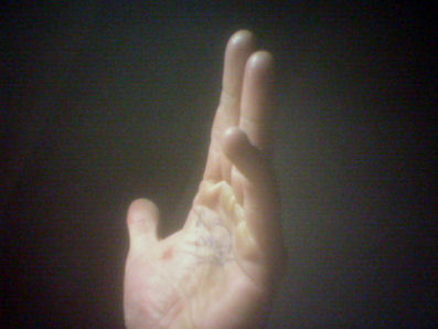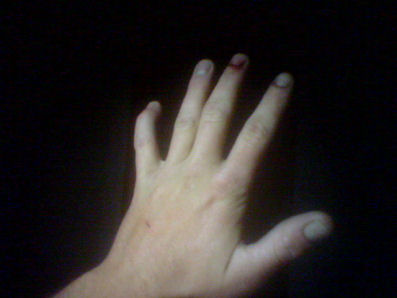 Friday later. Some, not all, hell breaks loose in the Sleeg. The boys and I are involved in an altercation leaving my finger looking like this.