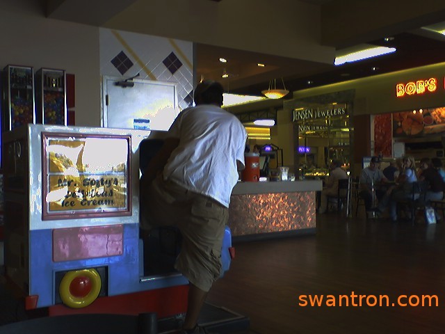 July 10, 2006: My hombre Voy provides some landscaper lunch comic relief by crawling into a little van thing at the mall.